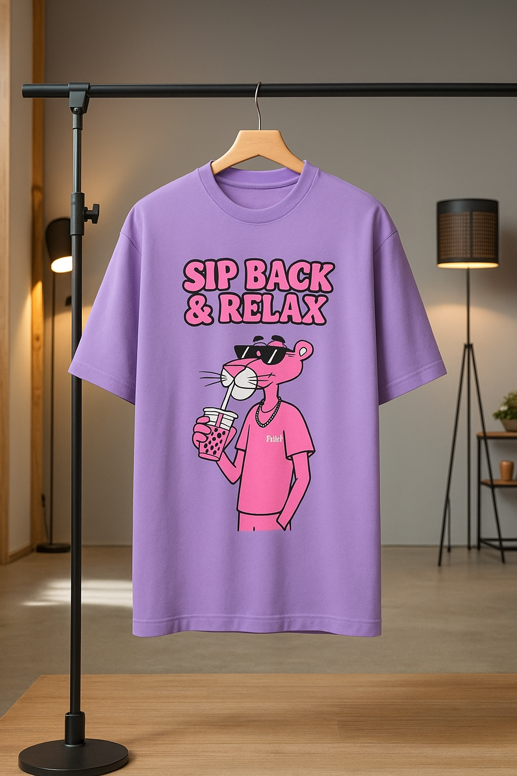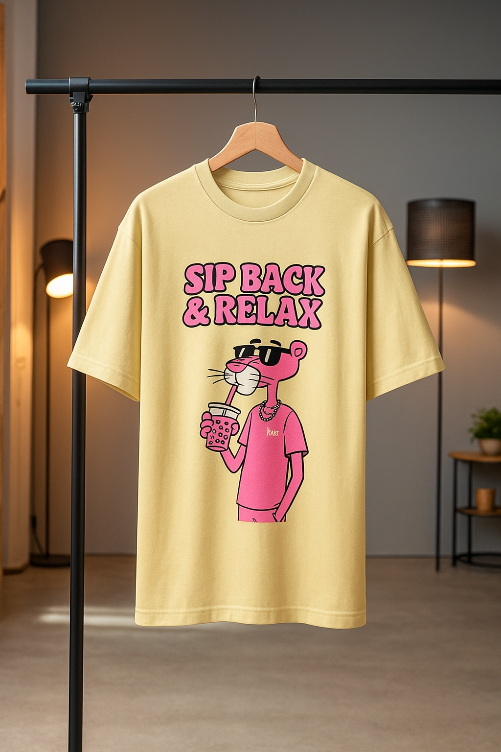 Add a cool and casual vibe to your wardrobe with this trendy graphic tee featuring a laid-back cartoon character enjoying a drink with style. Designed with bold text and a fun illustration, this t-shirt is perfect for anyone who loves comfort with a playful twist. Its relaxed fit and eye-catching design make it great for everyday wear, whether you're hanging out with friends, chilling at home, or stepping out in style. Pair it with jeans, shorts, or joggers to complete the look.